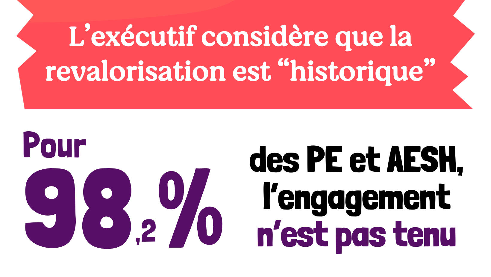 Dire ce n’est pas faire. Le Ministre, comme ses prédécesseurs, parle sans arrêt de «revalorisation historique», mais les personnels des écoles ne la perçoivent pas ainsi !Le chiffre est sans appel : pour 98% des collègues l’engagement n’a pas été tenu.