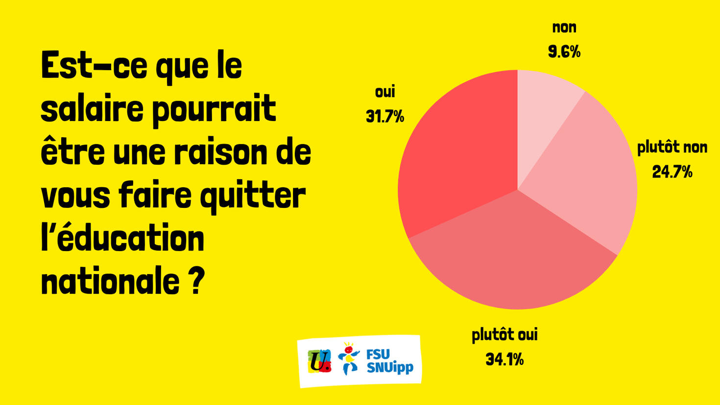 Au moment où se tiennent des discussions sur l’attractivité du métier enseignant, il serait temps que le ministère de l’Éducation nationale, le ministère de la Fonction Publique et celui des Finances entendent combien la rémunération est un enjeu fort pour l’avenir du métier enseignant. S’il n’y a pas de sursaut majeur dans la politique salariale de l’Éducation Nationale, la crise en cours ne pourra que s’amplifier.Les personnels n’attendent pas un énième coup de communication du ministre à destination de l'opinion publique et de la presse. Pas plus qu’il n’est acceptable de leur proposer de “travailler plus pour gagner plus” comme seule perspective face au déclassement salarial de leurs professions et à l’inflation galopante.Cette enquête montre clairement ce que les personnels exigent : une augmentation pour toutes et tous sans contrepartie.La FSU-SNUipp réclame :